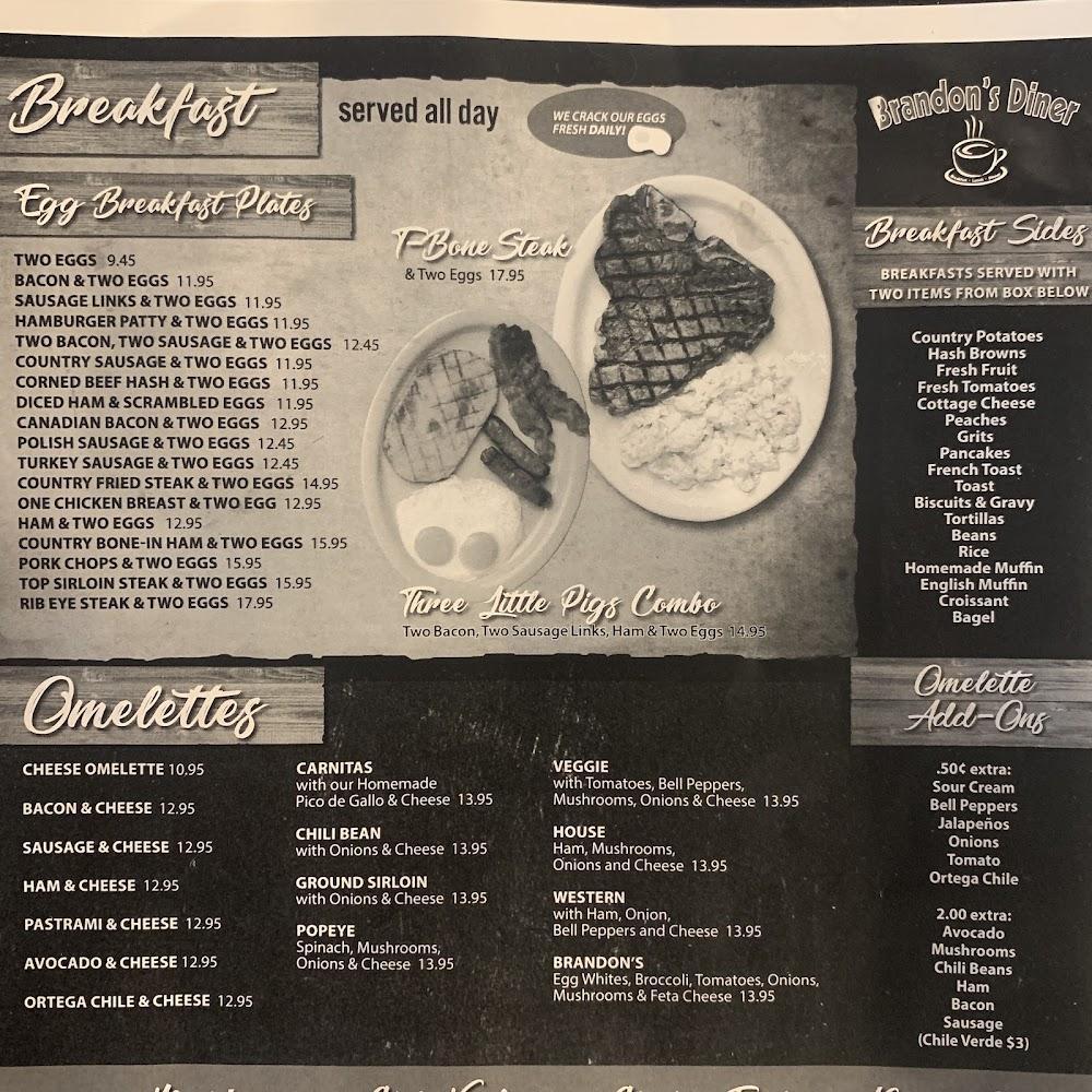 The menu at Brandon's Diner offers a fusion of American favorites with a twist of Mexican flair. Traditional breakfast items like pancakes, waffles, and omelettes dominate the mornings. Lunch and dinner feature hearty sandwiches, flavorful tacos, and robust entrees such as steaks and enchiladas.